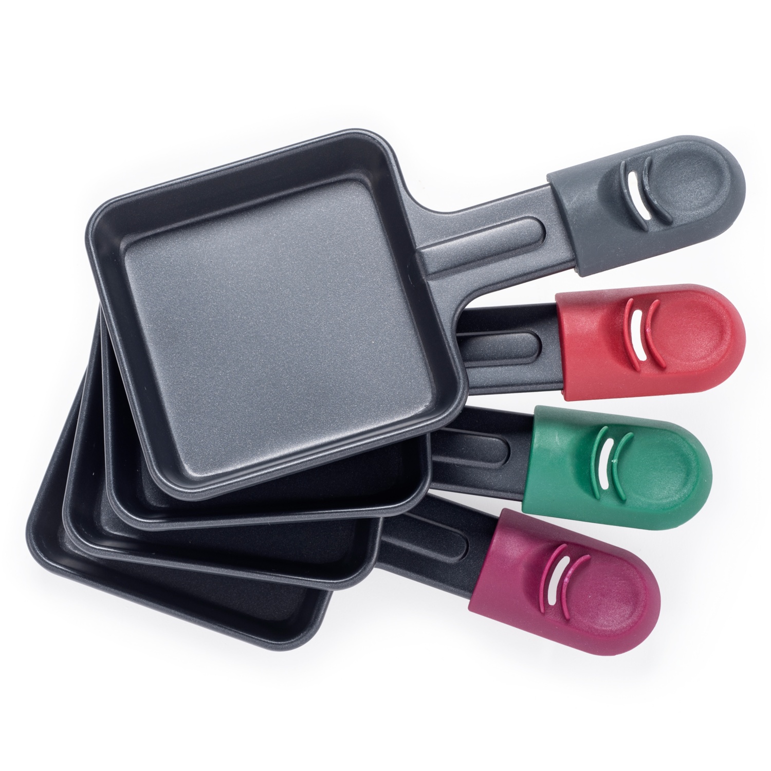 - 8 darab, tapadásgátló bevonattal ellátott, kis acélserpenyő hőszigetelt nyéllel és 8 darab műanyag spatula