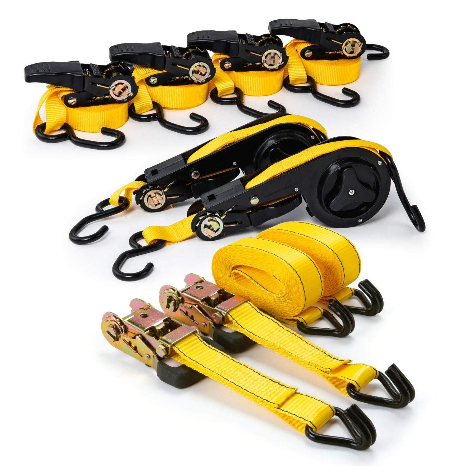 - 6 részes: 2 feszítőszíj szorítóval, 2 feszítőszíj racsnival és 2 feszítőszíj racsnival és S-kampóval vagy