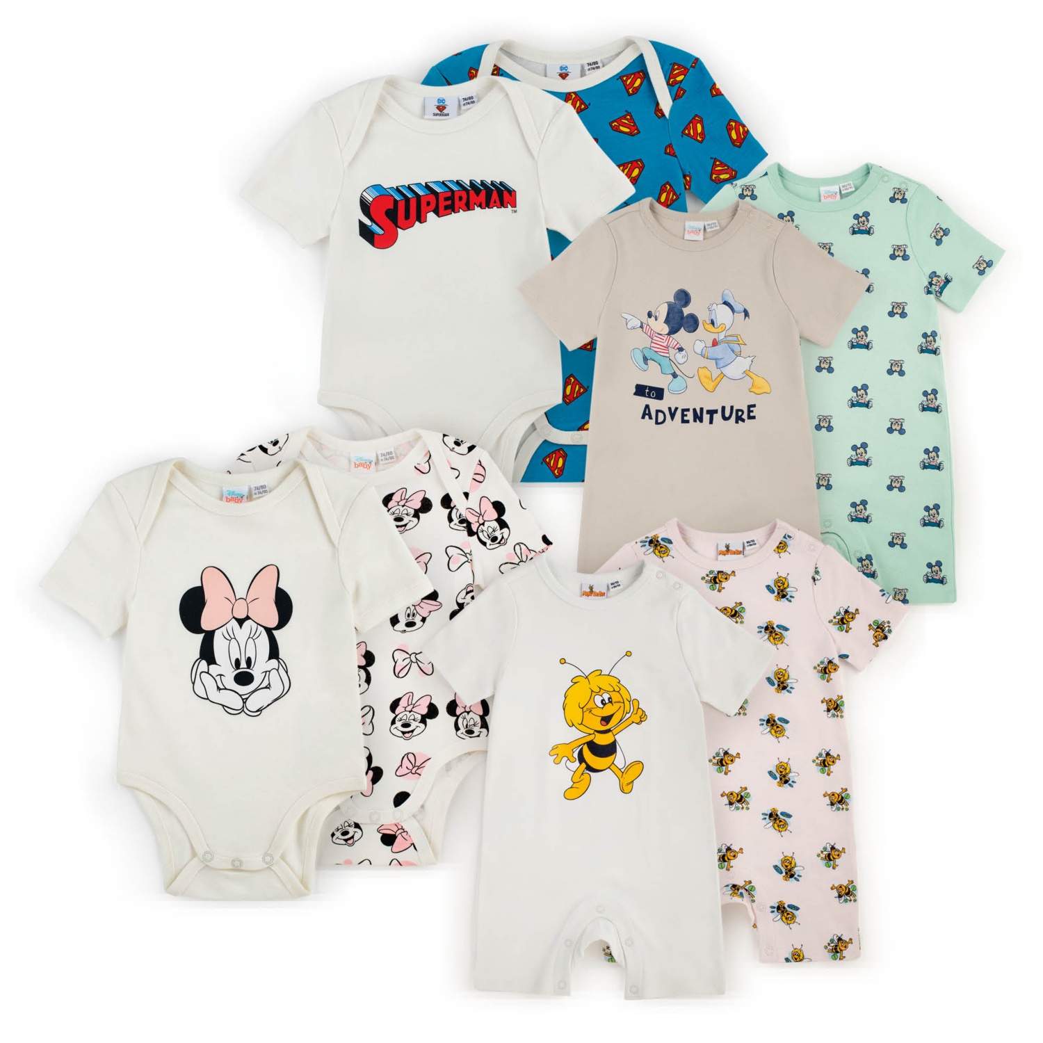 100 % pamut, különböző népszerű motívumokkal, méret: 62/68 - 98/104 2 darab/csomag Cikkszám: 819749