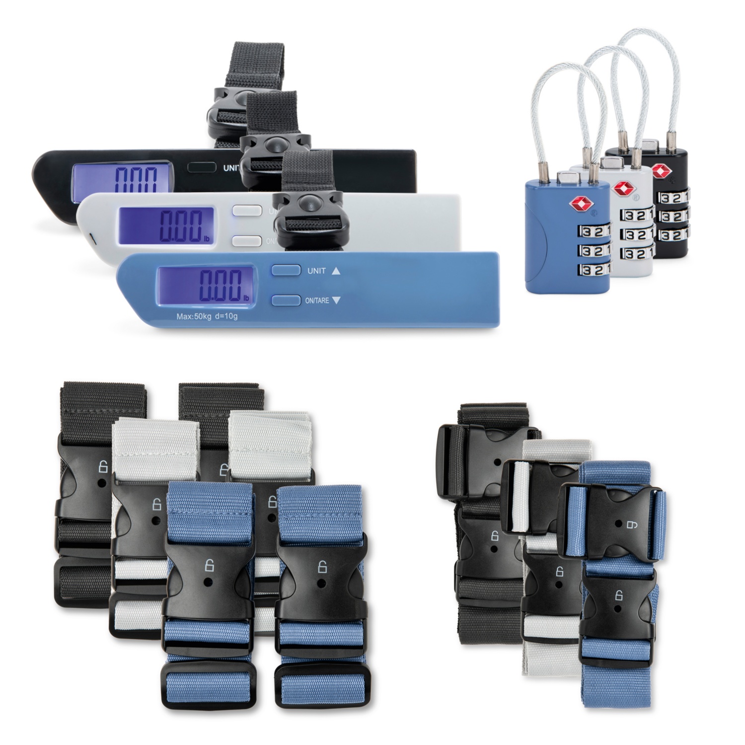 - digitális bőröndmérleg, 1 darab: csomagok méréséhez, max. 50 kg-ig, elemekkel együtt kapható
