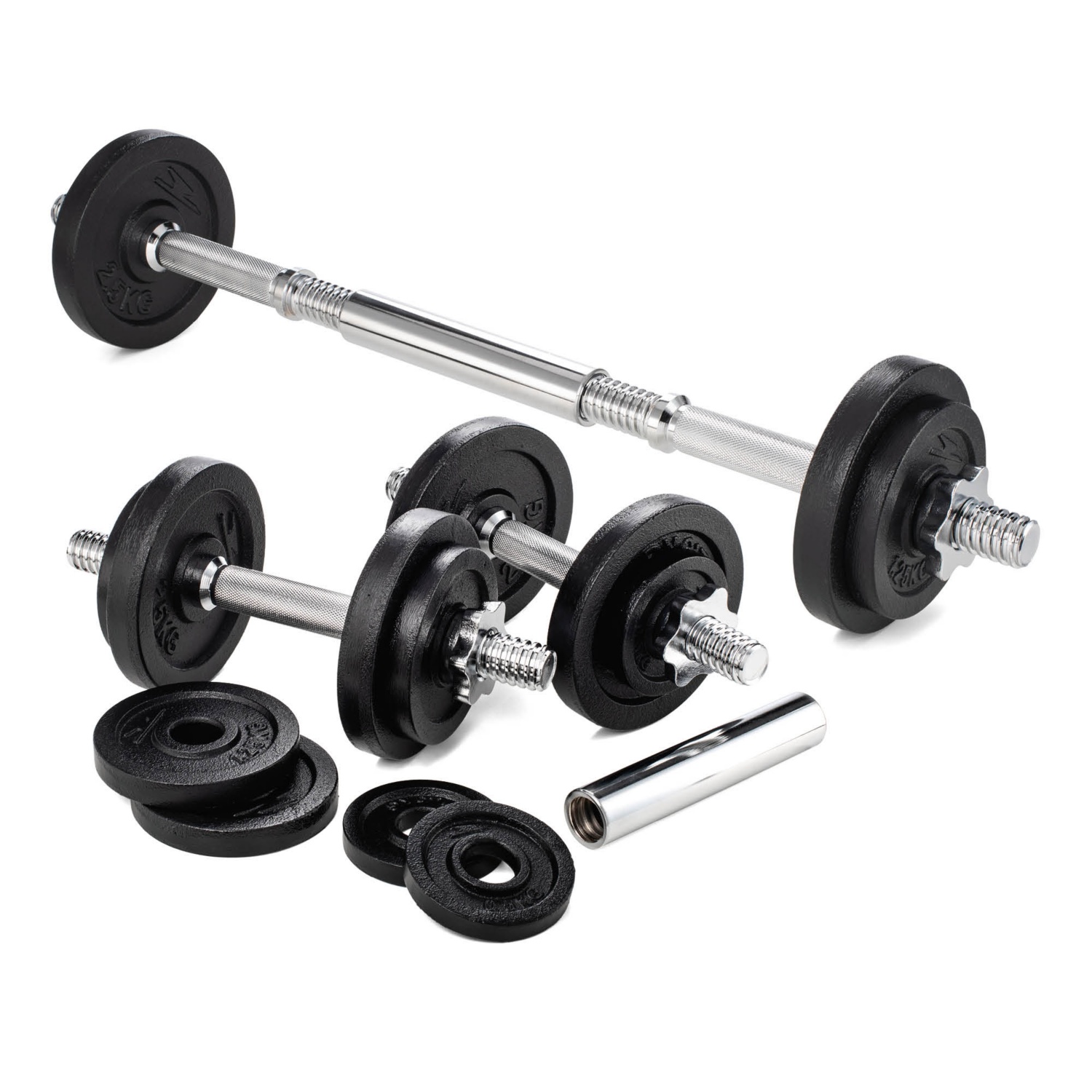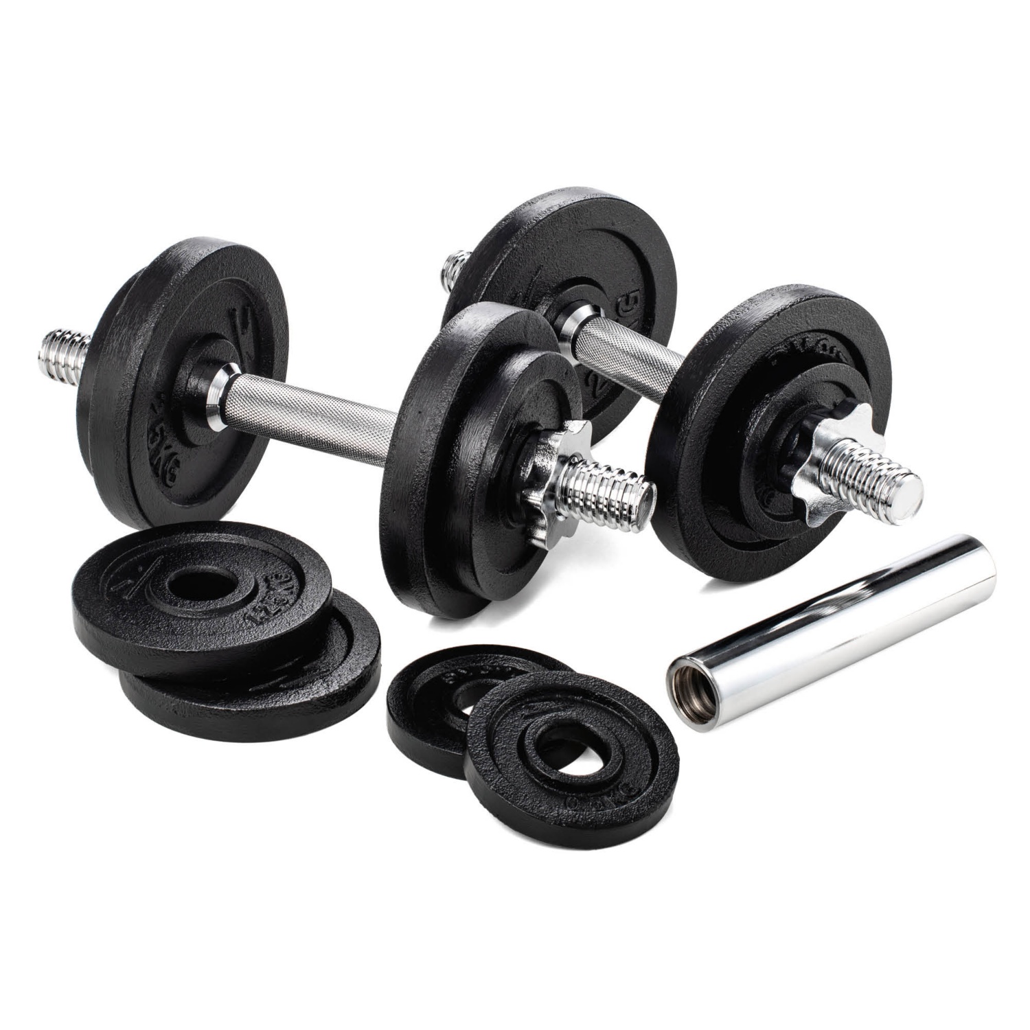 - két darab egykezes - kézkezes súlyzóvá alakítható - súlyzóból, ill. különböző öntöttvas súlyzótárcsákból álló készlet
