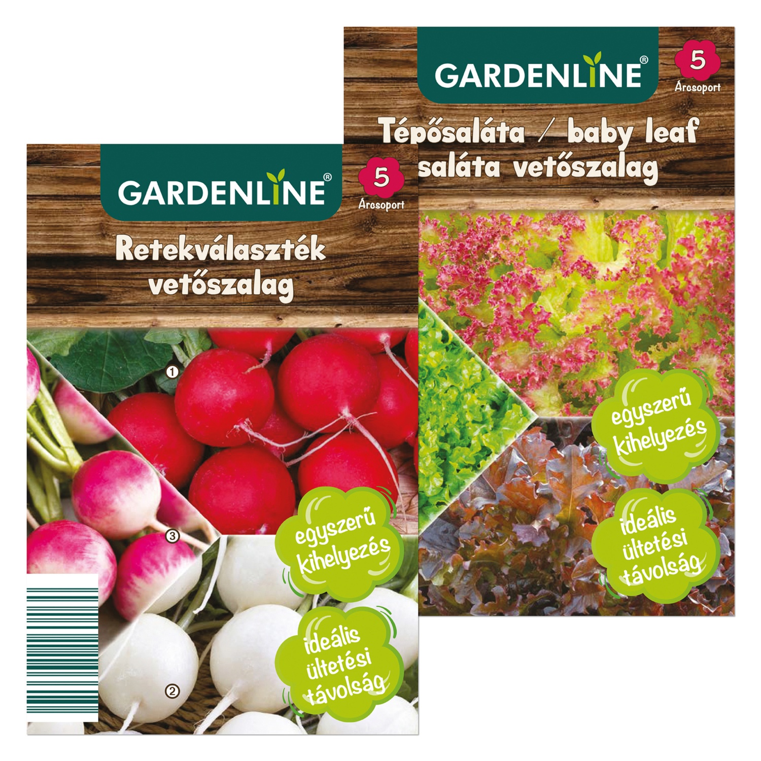 különböző fajták, egyszerű vetéshez, pl. konyhai fűszernövények, retek, tépősaláta stb.