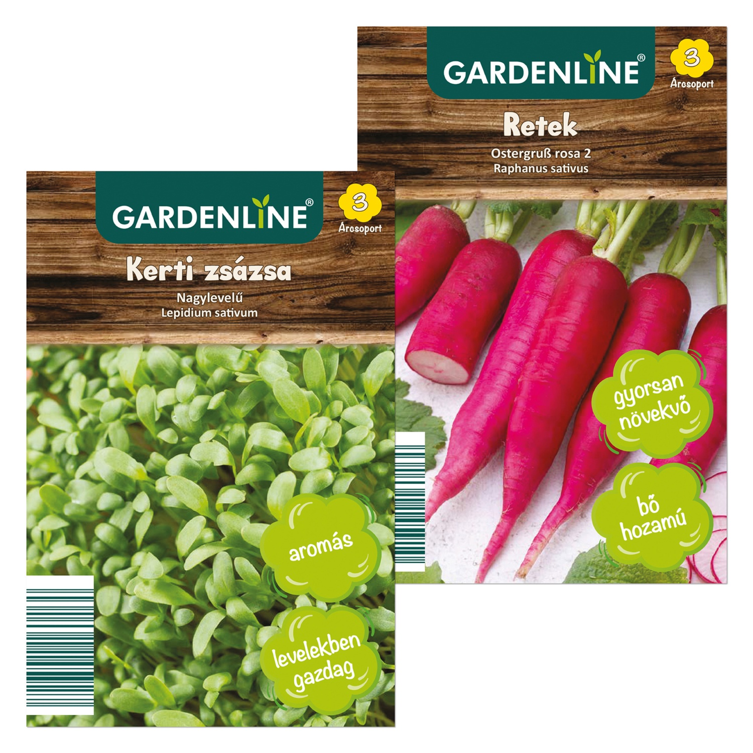 különböző fajták, pl. kerti zsázsa, retek stb.