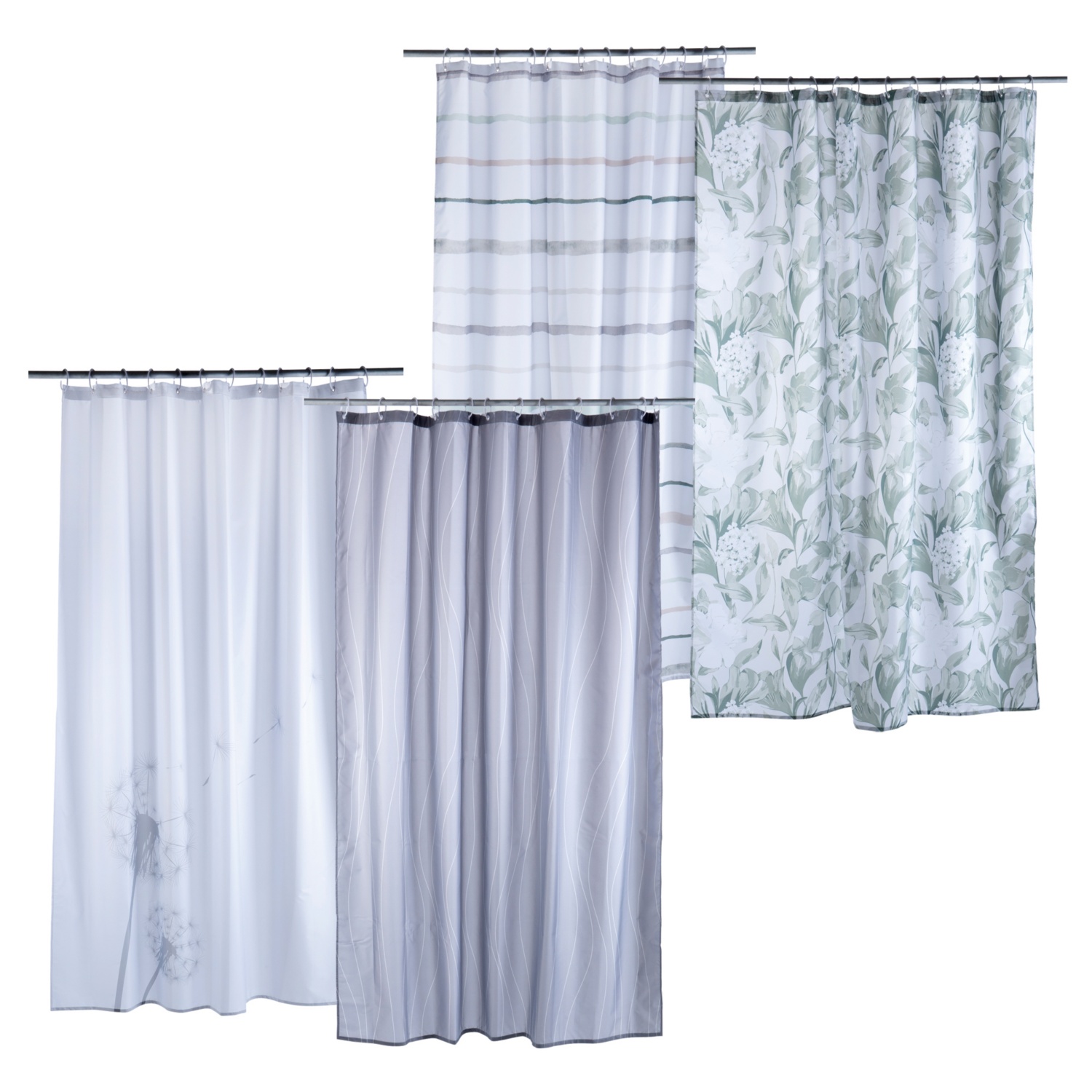 mintás vagy egyszínű, textilszövetből, 4 oldalon beszegett szélekkel és erősített lyuksorral, 12 stabil műanyag szemmel és 12 fehér műanyag karikával felakasztható, Öko-Tex Standard 100, méret: kb. 180 x 200 cm