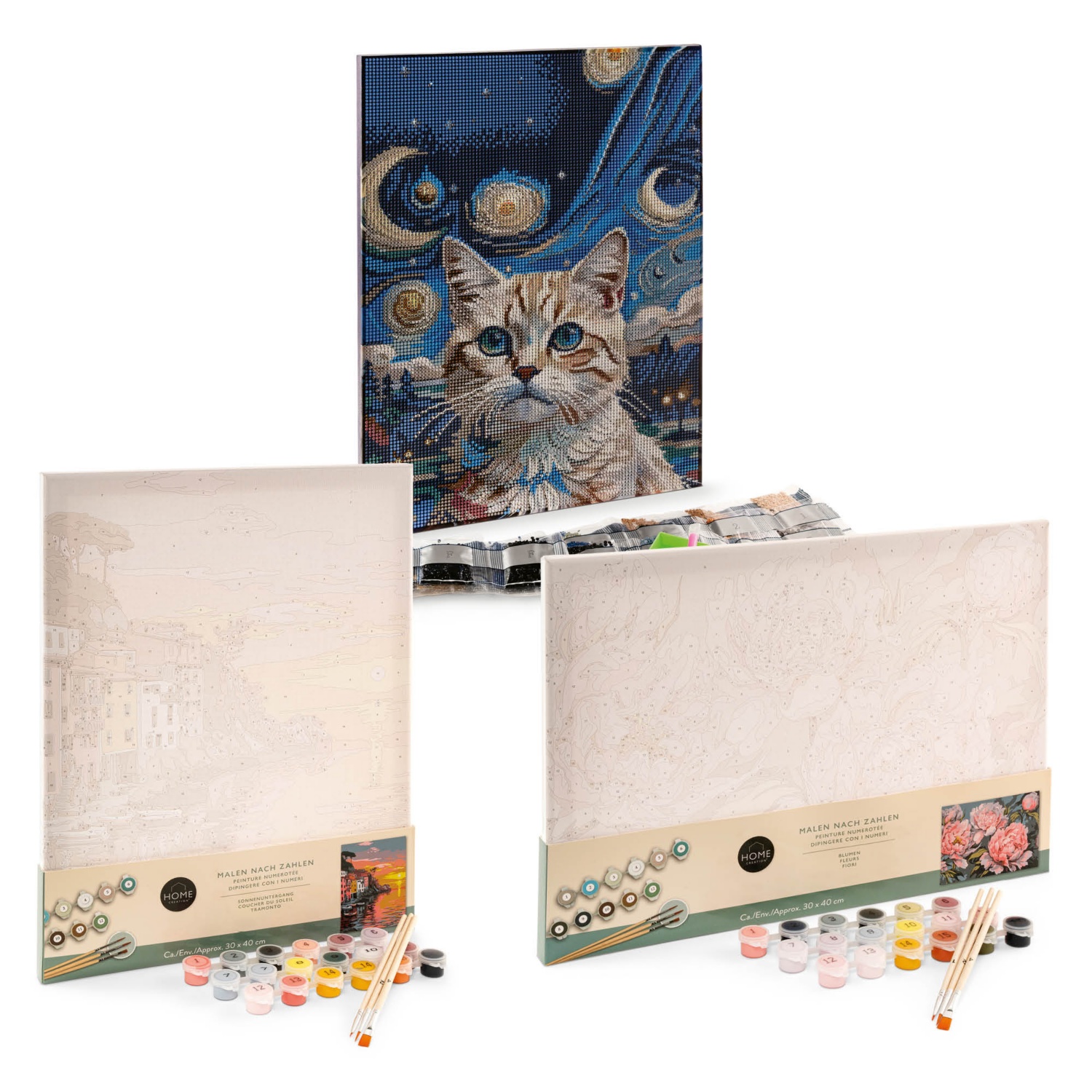 - festés számok szerint: vászonnal (kb. 30 x 40 cm), akrilfestékkel, 3 ecsettel, mintalapokkal