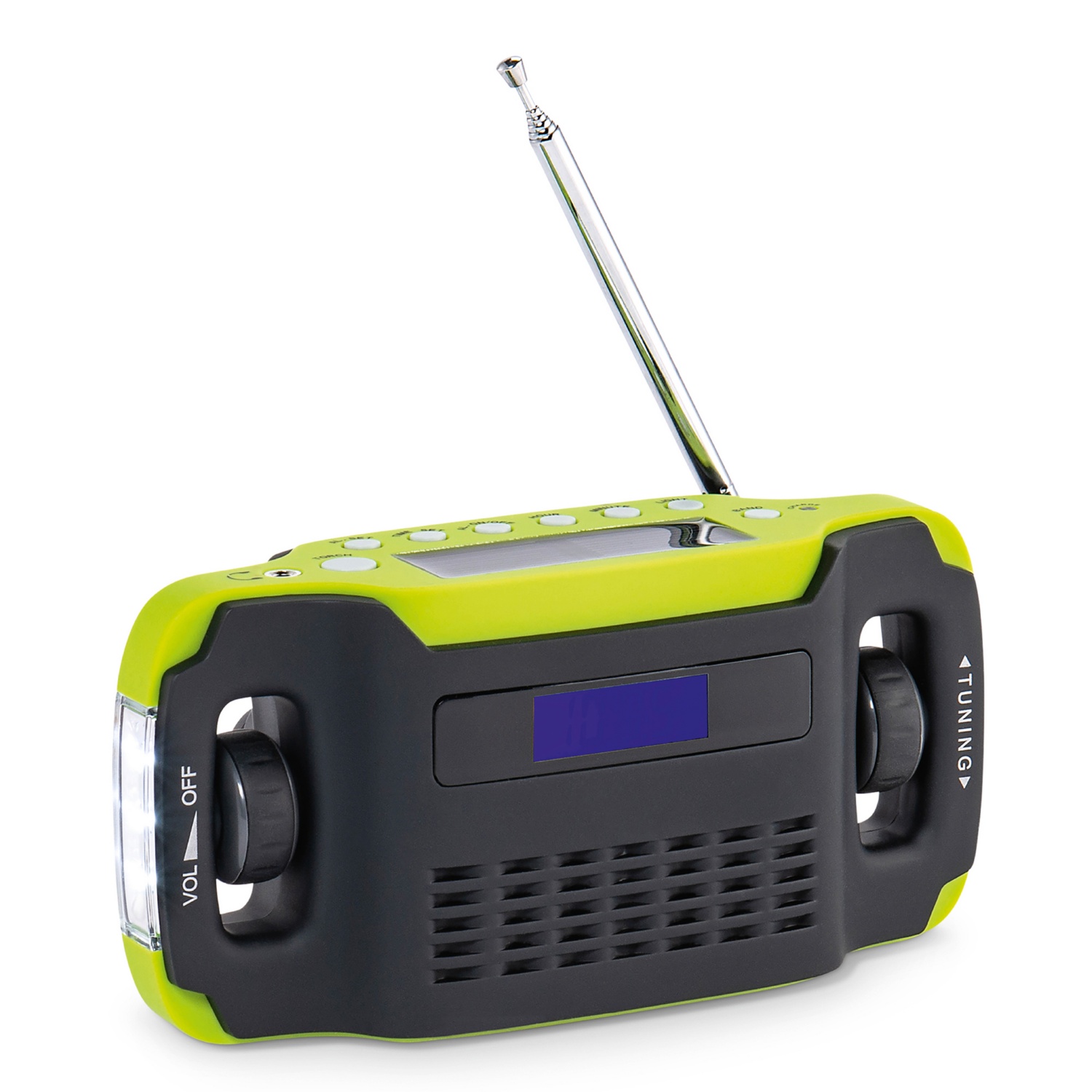 fejhallgató-csatlakozóval, vészhelyzeti okostelefon-töltő funkció a hajtókar segítségével, a rádió töltése hajtókarral, napenergiával vagy hálózati csatlakozóval lehetséges, méret: kb. 15,6 x 7,6 x 5,8 cm