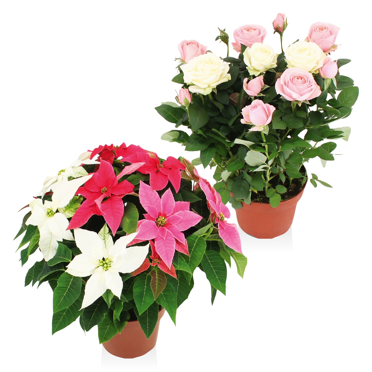 Mikulásvirág trió vagy cserepes rózsa duó