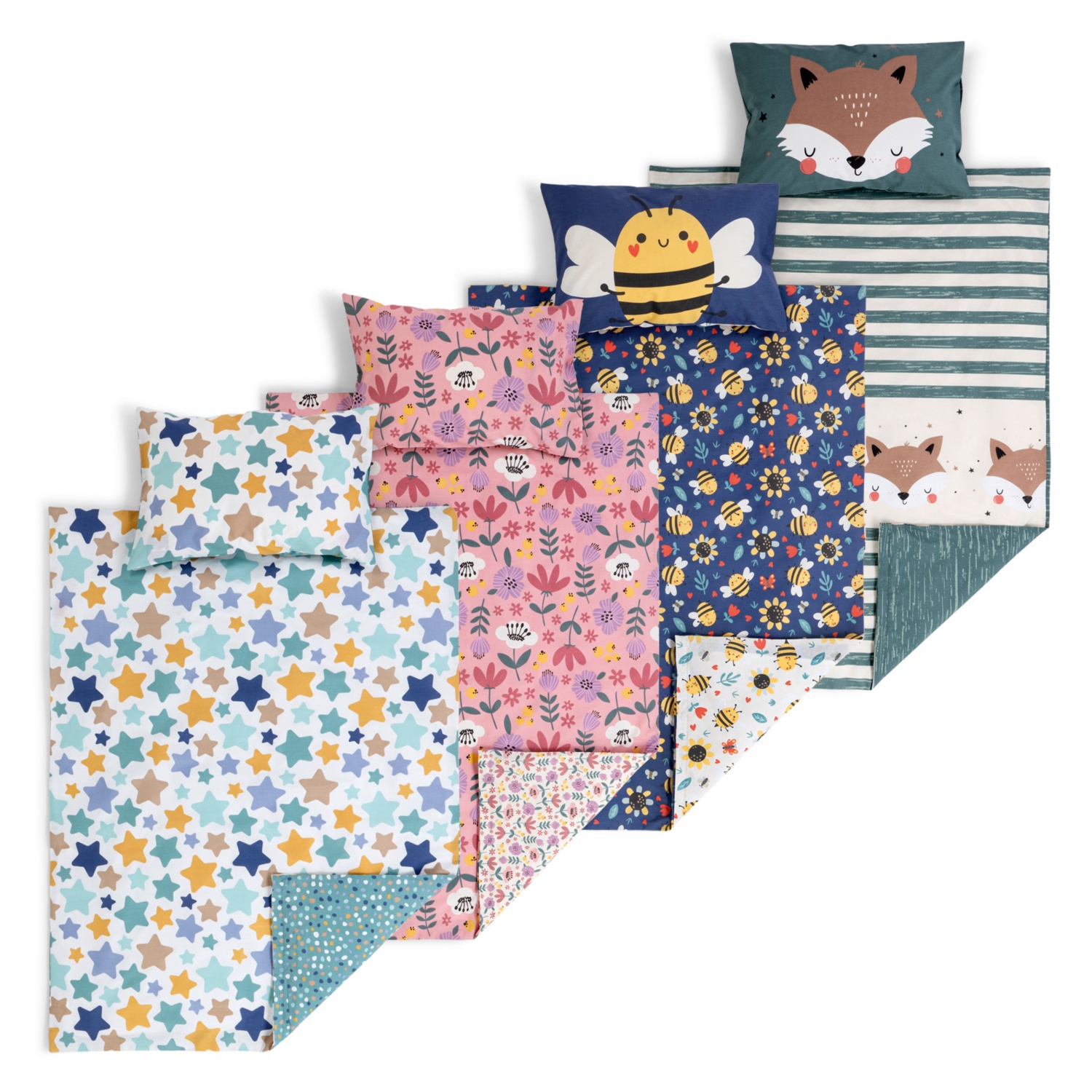 100 % pamut, párnahuzat mérete: 40 x 60 cm, paplanhuzat mérete: 100 x 135 cm, gumis lepedő mérete: 70 x 140 cm + kb. 15 cm-es magasság