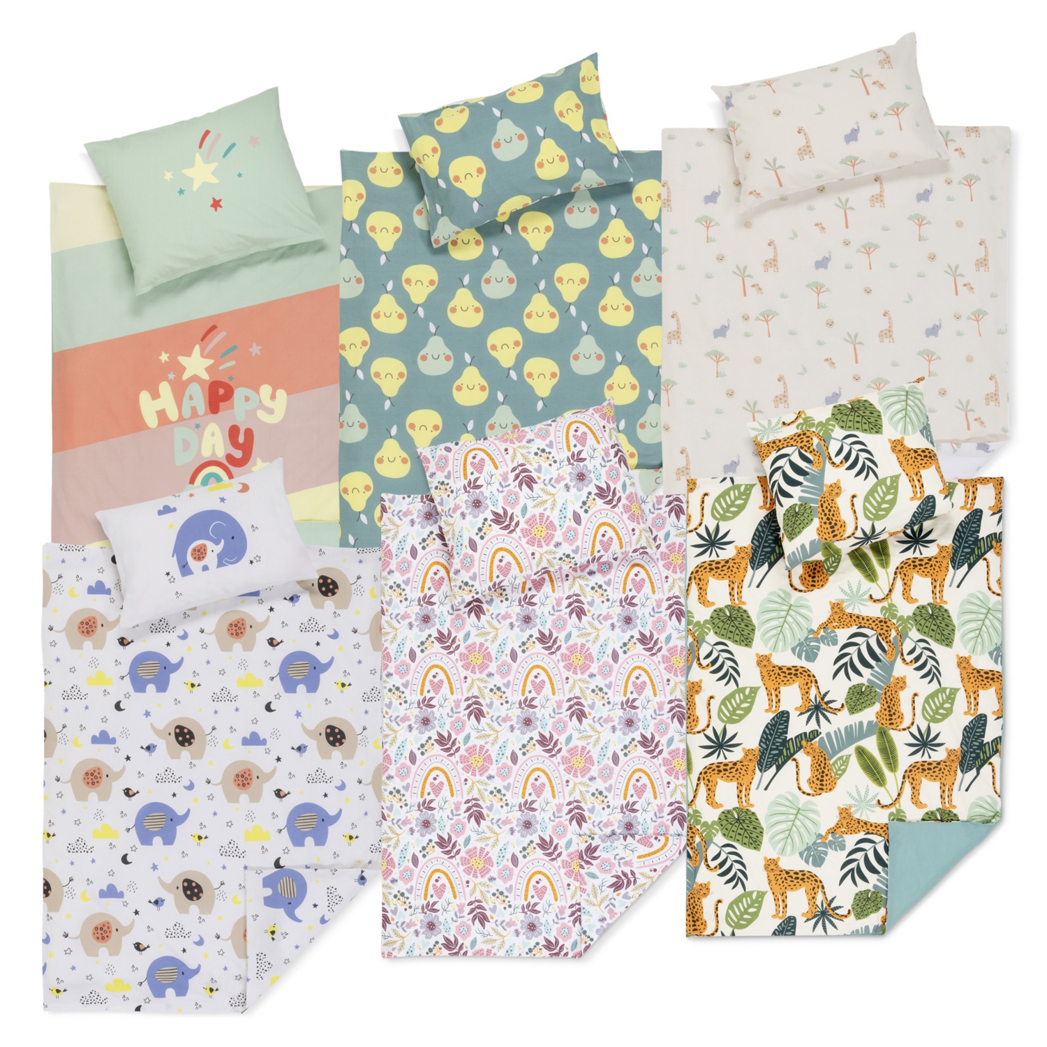100 % pamut, párnahuzat mérete: kb. 40 x 60 cm, paplanhuzat mérete: kb. 100 x 135 cm és gumis lepedő mérete: kb. 70 x 140 cm