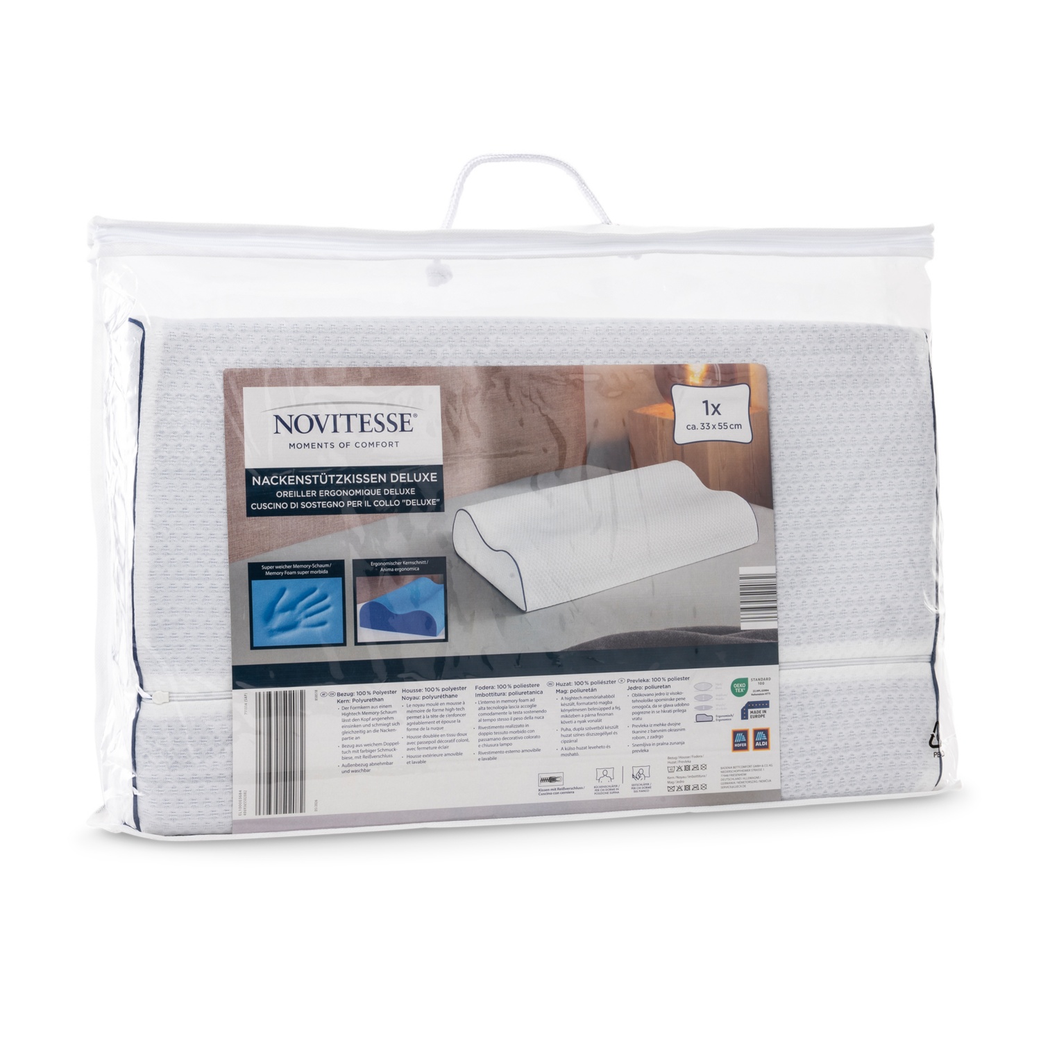 Der geformte Kern aus Hightech-Memory-Schaumstoff ermöglicht es dem Kopf, bequem einzusinken und sich an den Halsbereich anzupassen.