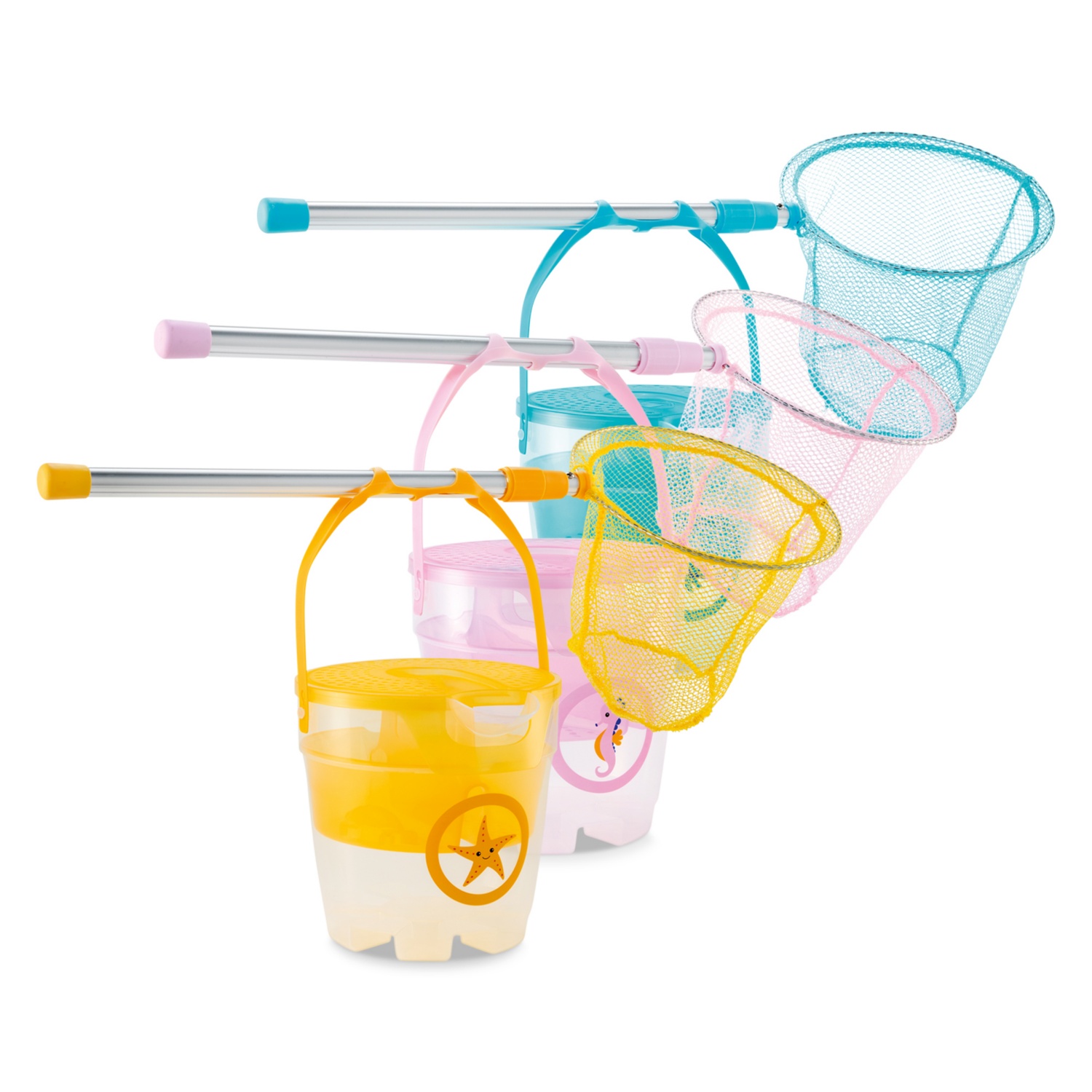 3 éves kortól ajánlott, a készlet tartalma: 1 darab masszív háló, kb. 57 - 84 cm között kihúzható teleszkópos rúddal, és 1 darab átlátszó vödör szitabetéttel