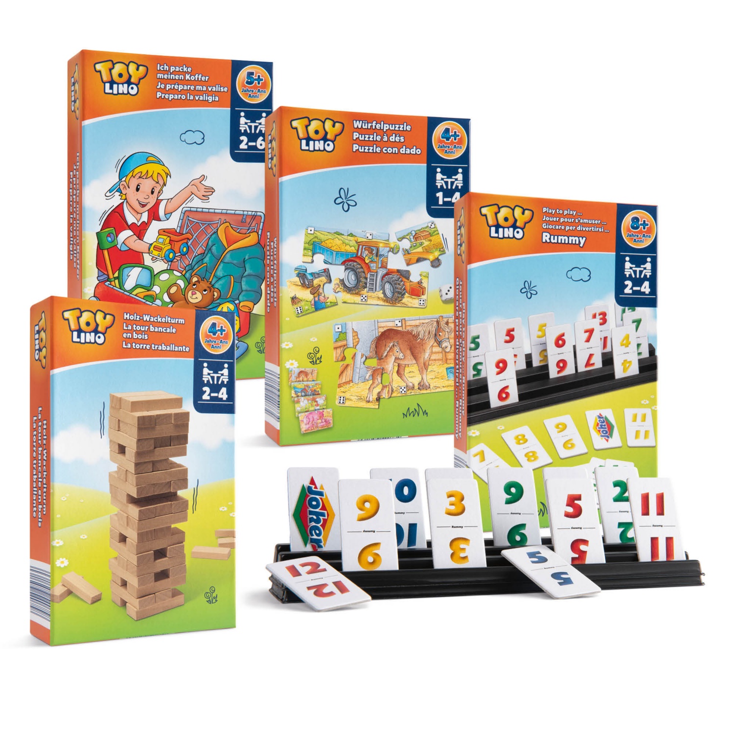 - többféle játék, pl. Dominó, Imbolygó torony, Memo stb.