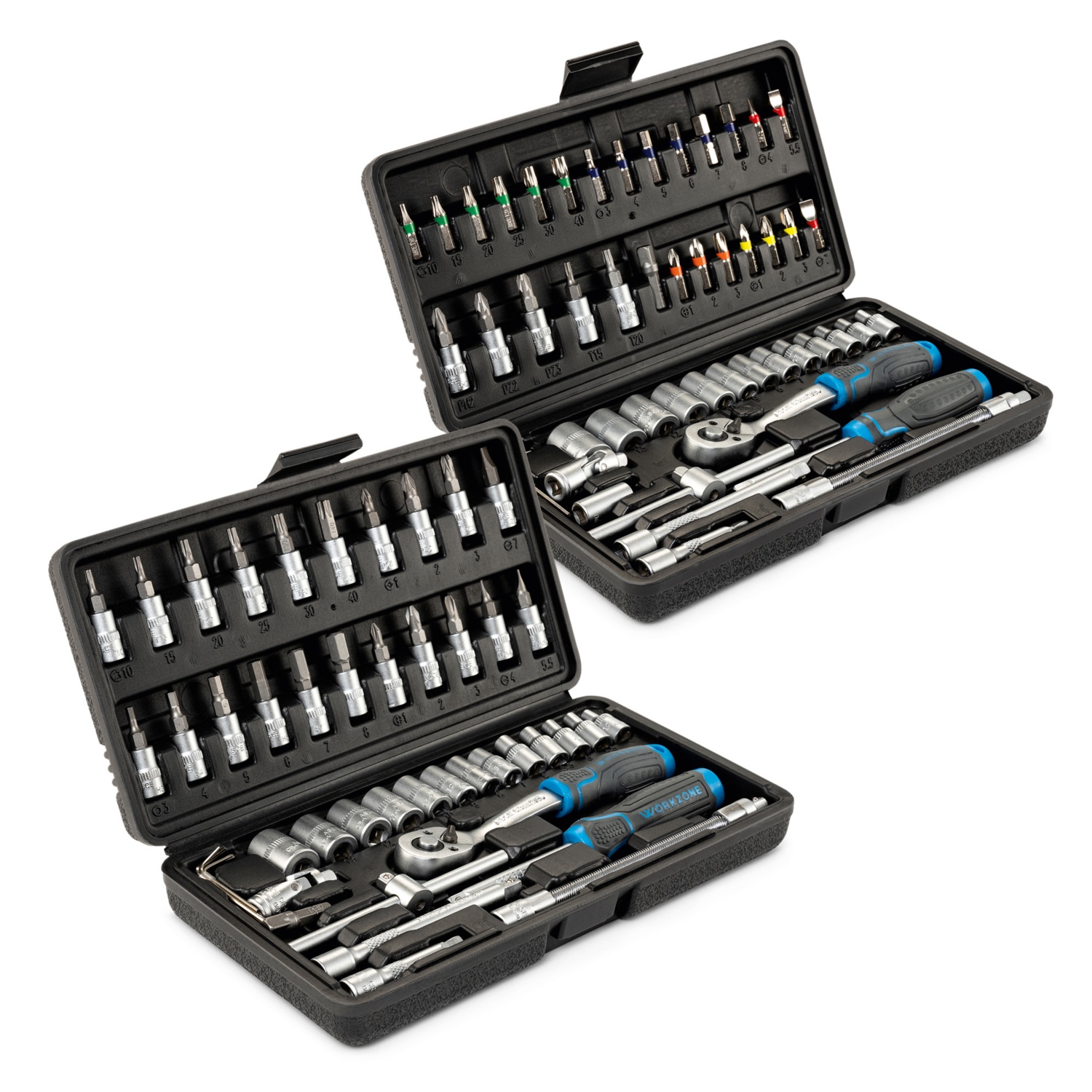 hatlapos, torx-, lapos, PZ- és PH-kereszthornyos bit dugókulcsok, masszív műanyag dobozban