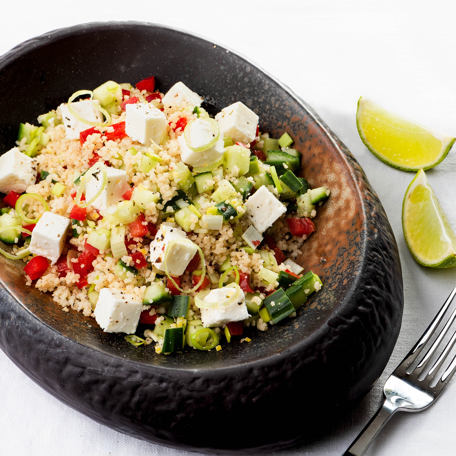 - Ha a kuszkusz kihűlt, beleforgatjuk a felaprított zöldségeket és a krémfehér sajtot, majd néhány csepp frissen facsart limelével vagy citromlével ízesítjük, ízlés szerint fűszerezzük.