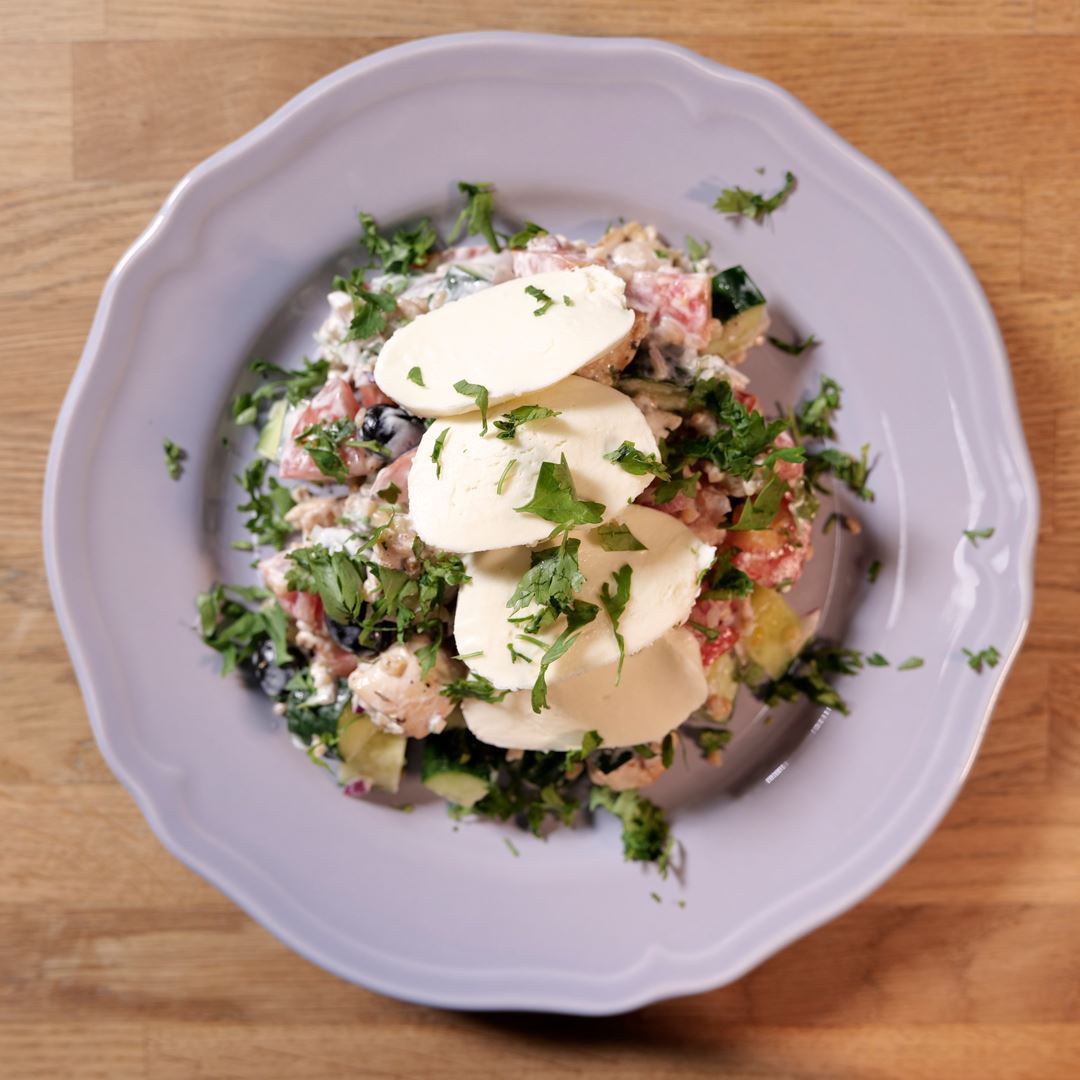 - Az uborkát és a paradicsomot kb. 2 cm-es kockákra, a lila hagymát apró kockákra vágjuk, majd az olajbogyóval és a joghurttal, illetve a korábban megsütött csirkemellel együtt a quioához keverjük.