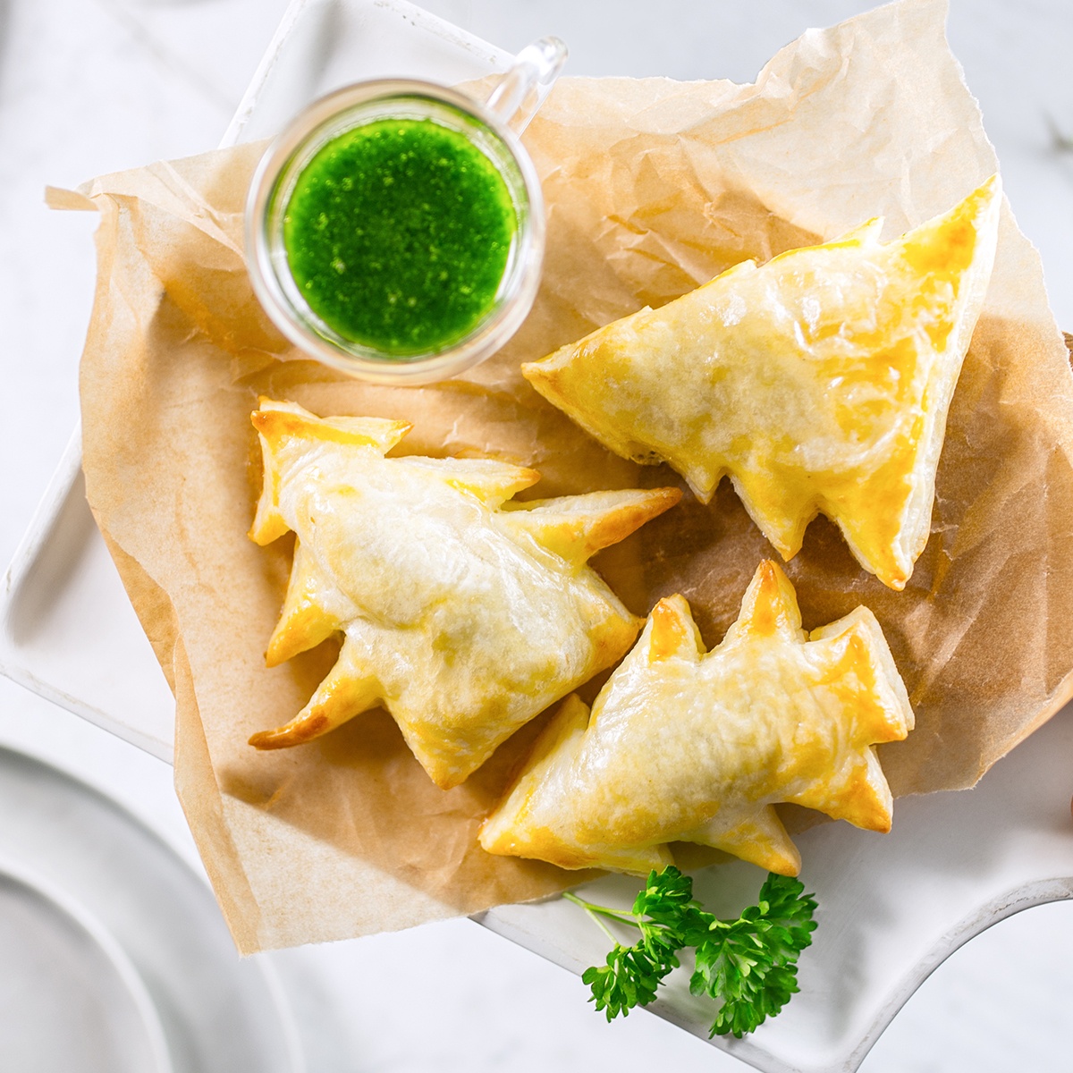 - A második tésztát a csirkemellfilére fektetjük, és a széleket jól lenyomkodjuk. A háromszögekből fenyőfa alakot készítünk, a maradék tojással megkenjük, majd a sütőben 180 °C-on kb. 10 perc alatt aranybarnára sütjük. A megmaradt pestóval tálaljuk.